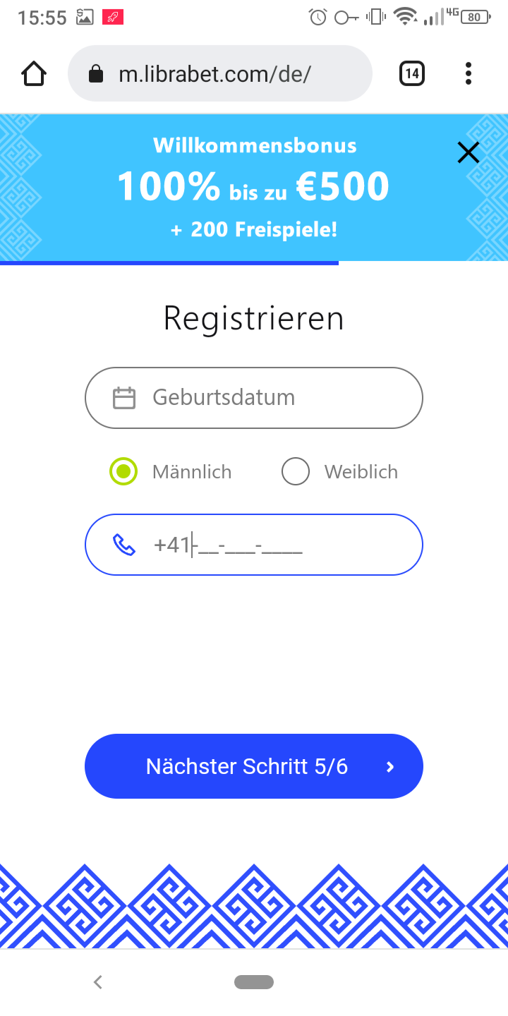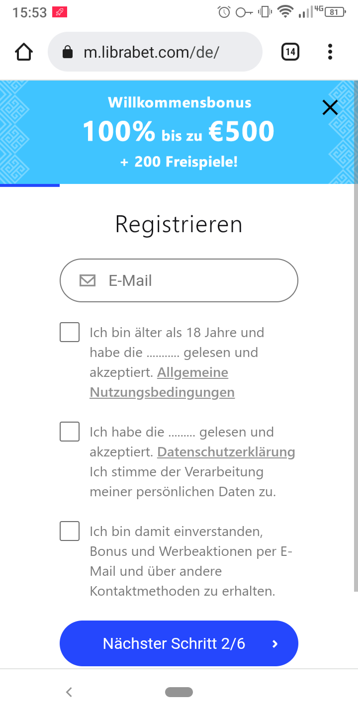 Die Registriereung bei Librabet Schweiz ist angenehm einfach. Klicken SIe auf unser Banner und suchen Sie die Schaltfläche «Registrieren» Hier folgenden Sie den einzelnen Schritten und klicken die notwendigen Felder an. Vergessen Sie nicht Ihre Emailadresse und Telefonnumer zu verifizieren. Schon können SIe einzahlen und mit dem Wetten bei Librebet Schweiz loslegen!